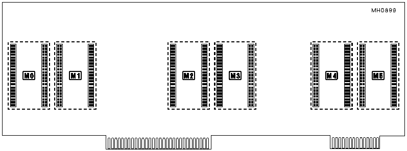 Note: The system memory card is factory configured with 4MB of DRAM on board. The system memory card uses proprietary memory modules, some require only one module space on the memory board, while others require two. In the cases where a double size module is used, the following space is marked with "-----------------", designating that space as occupied.